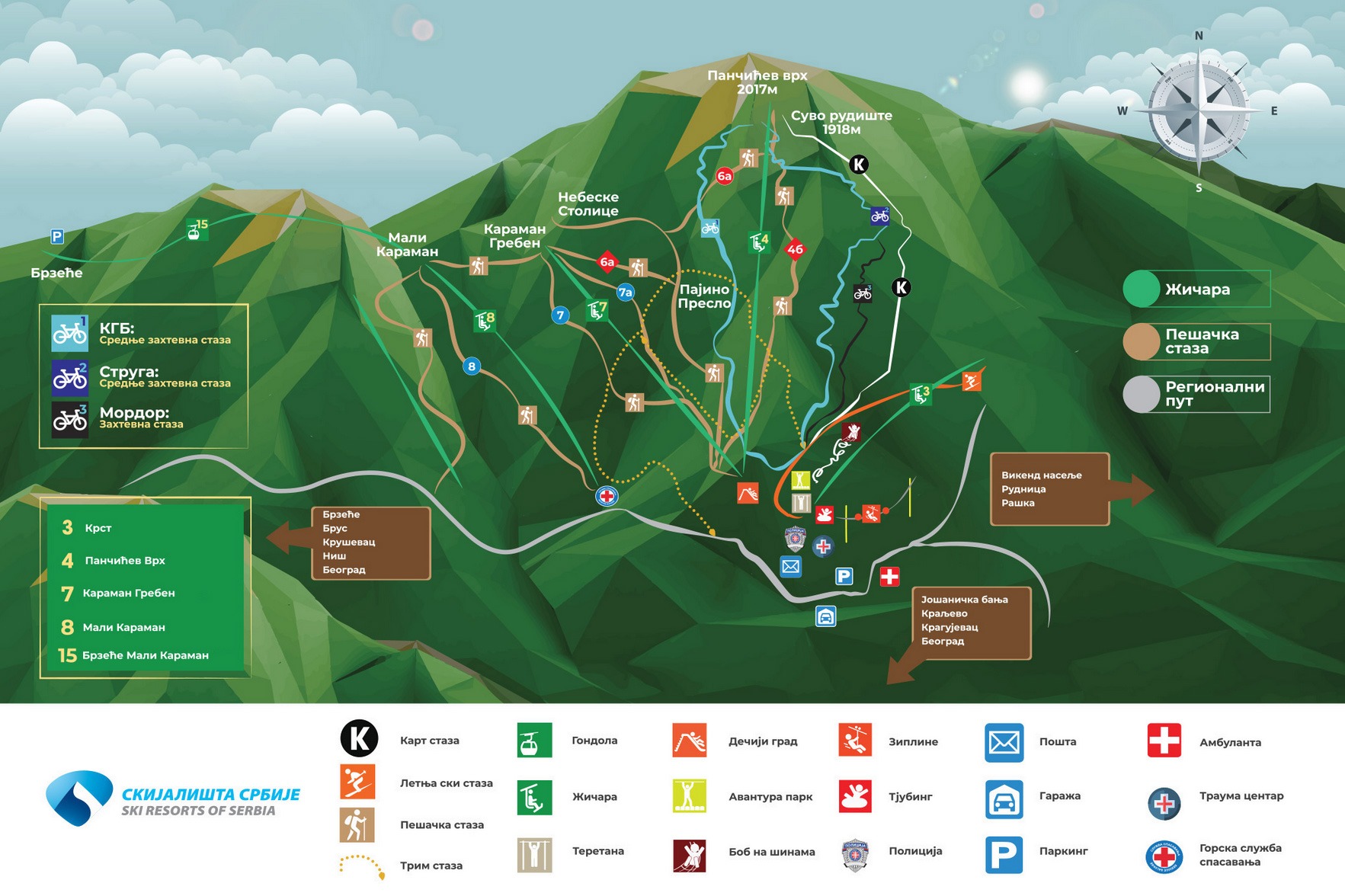 Kopaonik is home to the first downhill bike park in Serbia, featuring three trails of varying difficulty – KGB, Struga, and Mordor – with a total length of 5 km, suitable for both beginners and experienced riders. By installing bike racks on the Pančićev vrh cable car, easy transport of bikes to the trail starting points has been enabled, further enhancing the mountain biking offer. Since 2018, the selection has expanded to include e-bikes, making Kopaonik an ideal destination for cycling adventures.
